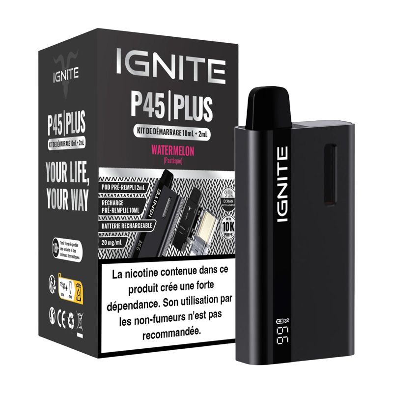 Découvrez le kit Ignite P45 Plus : une puff rechargeable avec cartouche pré remplie en e-liquide pour cigarette électronique. Une vapoteuse à la fois simple à prendre en main et ne nécessitant aucune maintenance, si ce n'est de juste recharger la batterie !