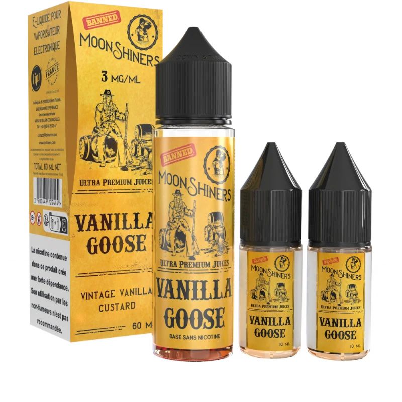 Cet e-liquide Vanilla Goose Moonshiners Liquids est disponible en plusieurs taux de nicotine ainsi qu'en différentes contenances. Il est tout d'abord disponible en e-liquide sans nicotine grand format de 60 ml. Il est décliné soit avec un booster aromatisé inclus pour du 3 mg/ml, soit avec deux boosters aromatisés inclus pour 6 mg/ml au final. L'avantage d'avoir des boosters aromatisés est qu'il n'y a aucun temps d'attente après avoir fait son mélange, l'e-liquide Vanilla Goose est consommable immédiatement sans perte de goût !