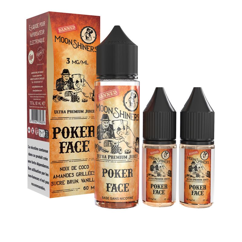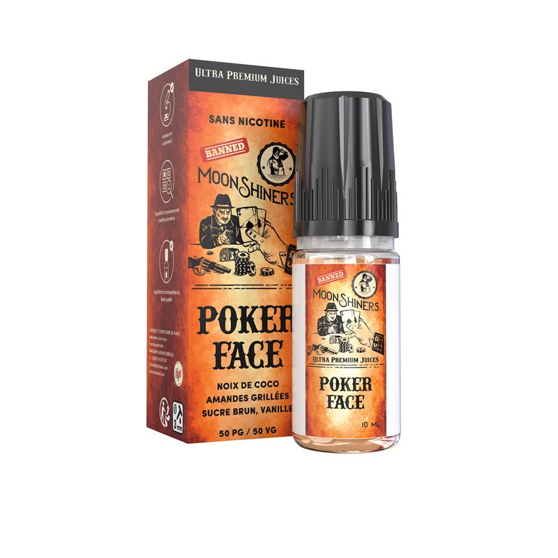 L'e-liquide Poker Face Moonshiners dispose d'une base 100% végétale sans additifs ni colorants. Elle est d'ailleurs éco-certifiée sans OGM tout en répondant aux normes ISO 9001 et AFNOR. La base du e-liquide Moonshiners Poker Face est composée à moitié de glycérine végétale et à moitié de propylène glycol pour aboutir à un mix 50% VG / 50% PG. Grâce à cela, il est compatible avec l'ensemble des vapoteuses : pod rechargeable, clearomiseur, reconstructible ou encore avec les drippers.